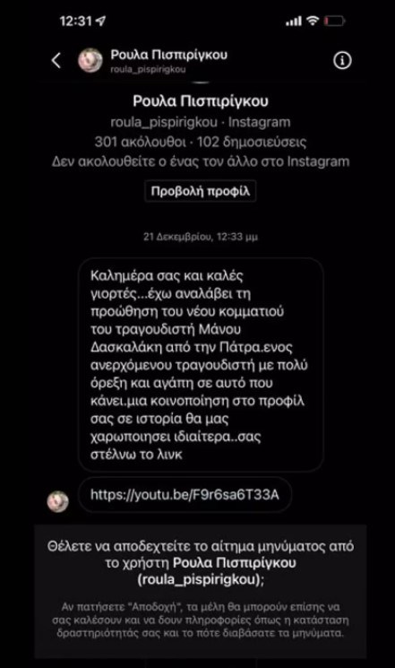 Το μήνυμα που της είχε στείλει η Ρούλα Πισπιρίγκου ήταν: