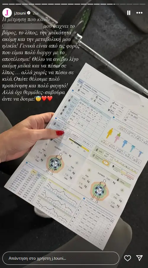 Η μέτρηση που κάνω μου δείχνει το βάρος, το λίπος, την μυϊκότητα ακόμη και την μεταβολική μου ηλικία! Γενικά είναι από τις φορές που είμαι πολύ happy με το αποτέλεσμα! Θέλω να ανέβω λίγο ακόμη μυϊκά και να πέσω σε λίπος… αλλά χωρίς να πέσω σε κιλά. Οπότε θέλουμε πολύ προπόνηση και πολύ φαγητό! Αλλά όχι θερμίδες-σαβούρα. Άντε να δούμε!», έγραψε χαρακτηριστικά.