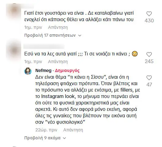 «Δεν είναι θέμα “τι κάνει η Σίσσυ”, είναι ότι η τηλεόραση φτιάχνει πρότυπα. Όταν βλέπεις και το πρόσωπο να αλλάζει με ενέσιμα, με fillers, με το Instagram look, το μήνυμα που περνάει είναι ότι ούτε τα φυσικά χαρακτηριστικά μας είναι αρκετά. Κι αυτό δεν αφορά μόνο εκείνη, αφορά όλες τις γυναίκες που βλέπουν την εικόνα αυτή σαν “νέο φυσιολογικό”».