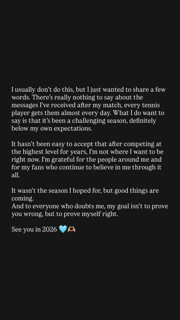 «Συνήθως δεν το κάνω αυτό, αλλά ήθελα απλώς να μοιραστώ μερικά λόγια. Δεν υπάρχει πραγματικά κάτι να πω για τα μηνύματα που έλαβα μετά τον αγώνα μου – κάθε τενίστρια τα λαμβάνει σχεδόν κάθε μέρα. Αυτό που θέλω να πω είναι ότι ήταν μια δύσκολη σεζόν, σίγουρα κάτω από τις δικές μου προσδοκίες.
