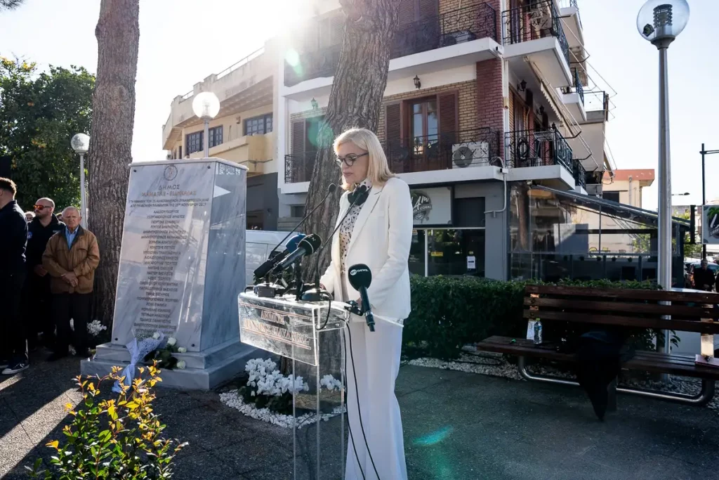 Στη συνέχεια, συμπλήρωσε: «Με βαθιά συγκίνηση και σεβασμό, προχωρούμε στην τελετή των αποκαλυπτηρίων της επιτήδειας στήλης που φέρει τα ονόματά τους. Μιας στήλης που θα θυμίζει σε όλους σήμερα και στο μέλλον, όχι μόνο τη μεγάλη τραγωδία αλλά και τη δύναμη της μνήμης».