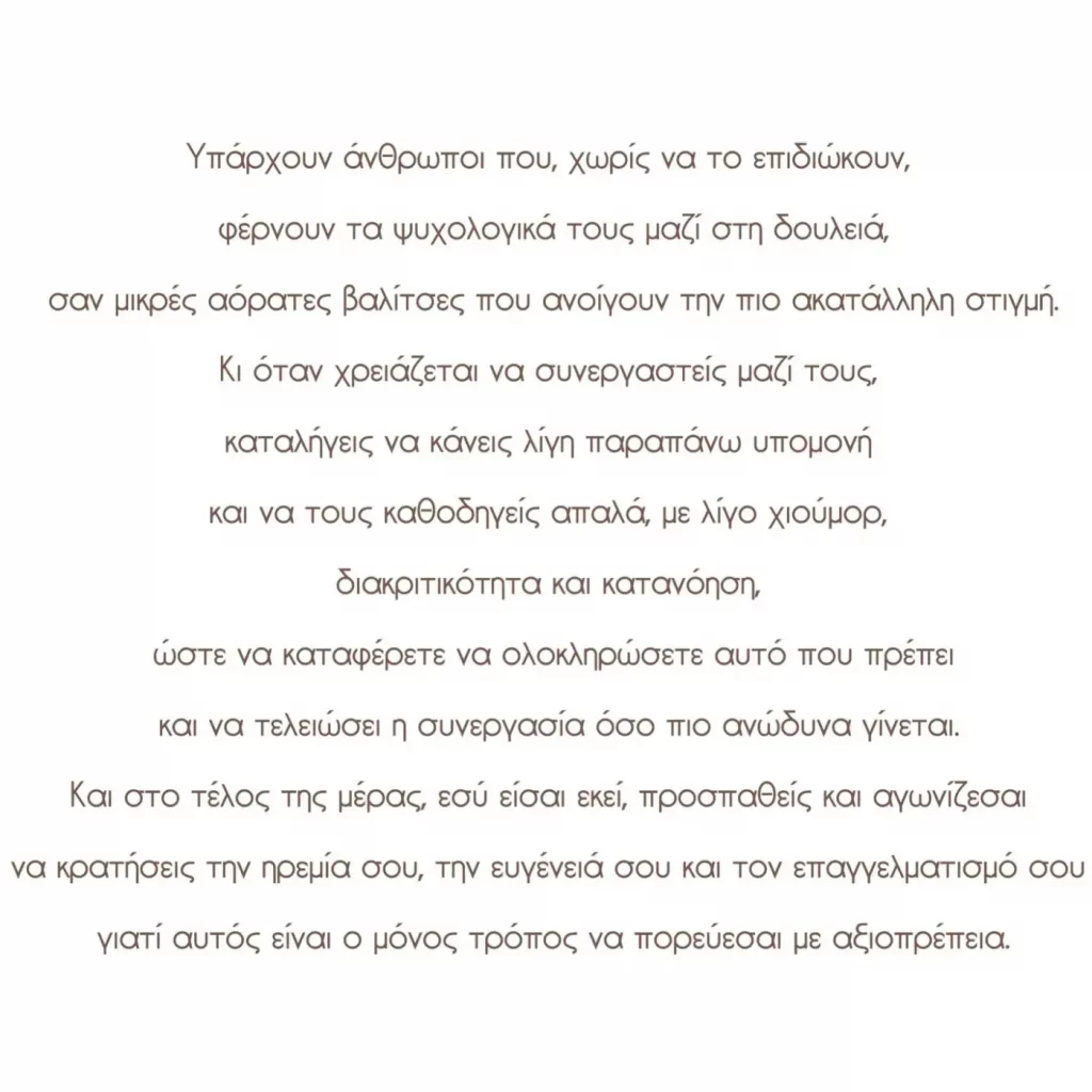 «Υπάρχουν άνθρωποι που, χωρίς να το επιδιώκουν, φέρνουν τα ψυχολογικά τους μαζί στη δουλειά, σαν μικρές αόρατες βαλίτσες που ανοίγουν την πιο ακατάλληλη στιγμή. Κι όταν χρειάζεται να συνεργαστείς μαζί τους, καταλήγεις να κάνεις λίγη παραπάνω υπομονή και να τους καθοδηγείς απαλά, με λίγο χιούμορ, διακριτικότητα και κατανόηση, ώστε να καταφέρετε να ολοκληρώσετε αυτό που πρέπει και να τελειώσει η συνεργασία όσο πιο ανώδυνα γίνεται.