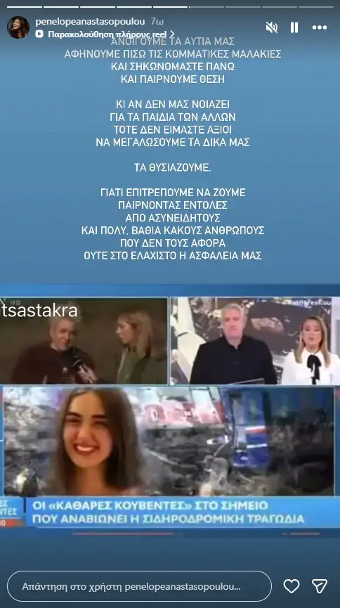 Η Πηνελόπη Αναστασοπούλου παρακολουθώντας ρεπορτάζ για τα τρία χρόνια από την πολύνεκρη τραγωδία στα Τέμπη, ξεσπά με το νέο της μήνυμα στα social media.