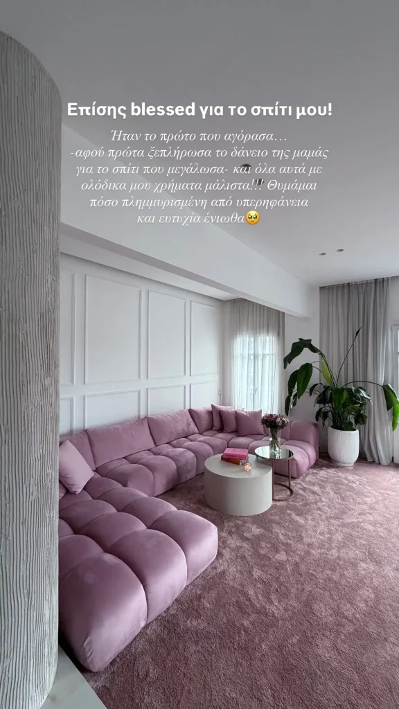 Η δημοφιλής influencer εξέφρασε την ευγνωμοσύνη της για το διαμέρισμα όπου μένει σήμερα, τονίζοντας ότι πρόκειται για μια αγορά που πραγματοποίησε με δικά της χρήματα. Όπως αποκάλυψε, είχε προηγηθεί η αποπληρωμή του δανείου της μητέρας της για το σπίτι στο οποίο μεγάλωσε.