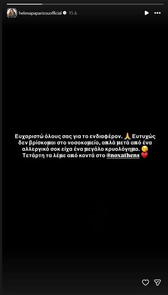 «Ευχαριστώ όλους σας για το ενδιαφέρον. Ευτυχώς δεν βρίσκομαι στο νοσοκομείο, απλά μετά από ένα αλλεργικό σοκ είχα ένα μεγάλο κρυολόγημα. Τετάρτη τα λέμε από κοντά στο Nox», έγραψε χαρακτηριστικά στην ανάρτησή της η τραγουδίστρια.