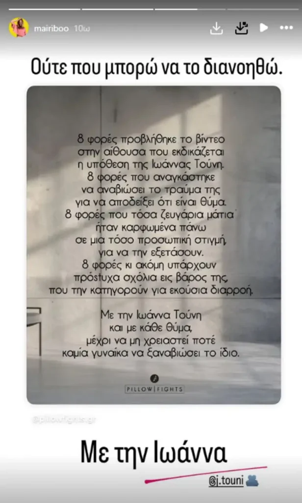 Η Μαίρη Συνατσάκη αλλά και πλήθος γυναικών που γνωρίζουν ή και όχι την Influencer στήριξαν δημόσια την Ιωάννα Τούνη, μη μπορώντας να πιστέψουν ότι η ίδια έπρεπε να ξαναδεί το επίμαχο βίντεο με τις προσωπικές στιγμές της οκτώ φορές, μπροστά σε τόσο κόσμο.