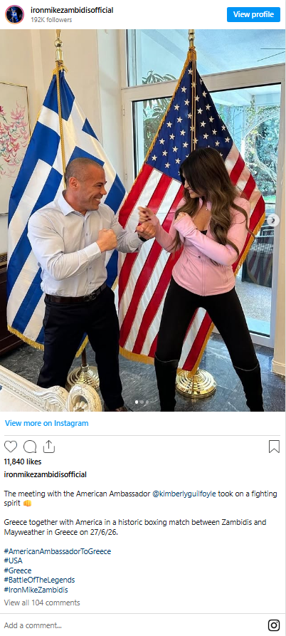 Μέσα από αναρτήσεις στα μέσα κοινωνικής δικτύωσης, ο Μιχάλης Ζαμπίδης μοιράστηκε στιγμιότυπα από την επίσκεψη, στα οποία καταγράφεται ένα σύντομο, συμβολικό «μάθημα» μποξ προς την Κίμπερλι Γκίλφοϊλ.